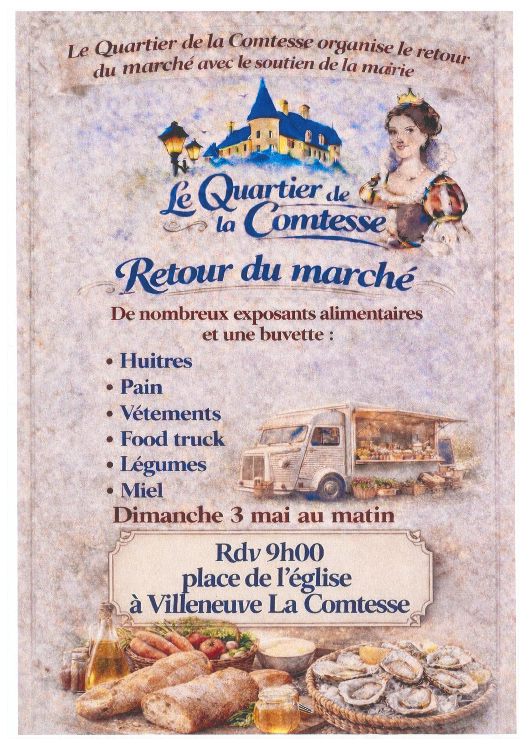 Actualités Le Quartier de la Comtesse organise un loto le mercredi 29 avril 2026 a 14h00 salle de la poste les restaurants du coeur 41 ème CAMPAGNE ETE 2026 Calendrier et contact du restaurants du cœur a Villeneuve la comtesse Le Quartier de la Comtesse avec le soutien de la mairie annonce le retour du marché le dimanche 3 mai a 9h place de l église TROC PLANTES A L A BIBLIOTHEQUE de villeneuve la comtesese samedi 9 mai de 14 h a 17h Nouvelle association de Villeneuve La Comtesse Le Quartier de la Comtesse Ma Prime Rénove Panneau Pocket est arrivé dans notre commune de villeneuve la comtesse LIEUX D’ACCUEIL ENFANTS PARENTS des Vals de Saintonge le pass pour accéder au déchetteries Voir toutes les actualités