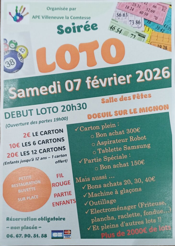 loto organisée par ape de villeneuve la comtesse le samedi 7 fevrier 2026 Facebook Twitter LinkedIn Email Imprimer