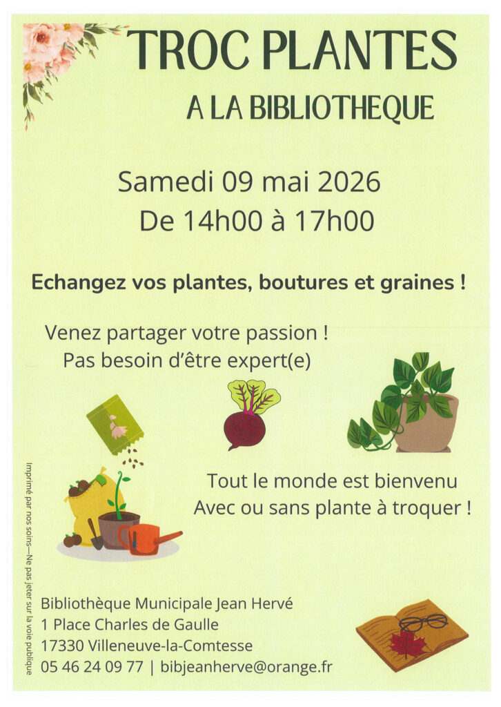 TROC PLANTES A L A BIBLIOTHEQUE de villeneuve la comtesese samedi 9 mai de 14 h a 17h Facebook Twitter LinkedIn Email Imprimer